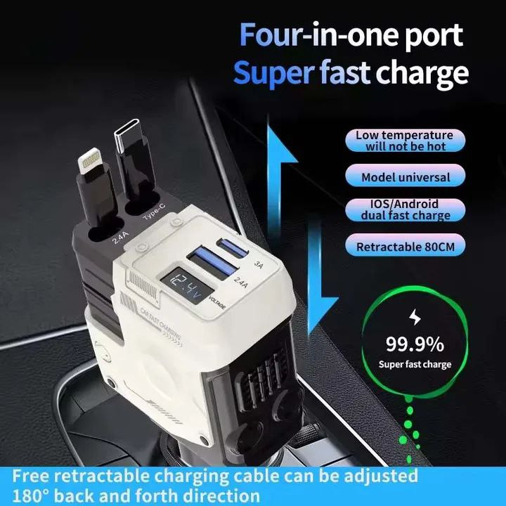 شارژر فندکی فست شارژ 4 منظوره دارای صفحه دیجیتالی و میتونید همزمان هم گوشی , تبلت . آیپاد خود را شارژ کنید دارای 2 عدد کابل 80 سانتیمتری برای آیفون و تایپ C می باشد